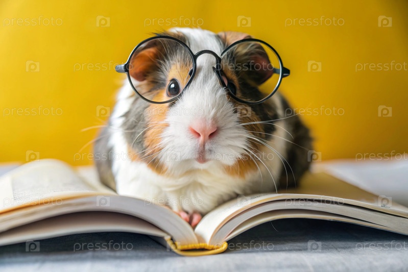 Забавная маленькая морская свинка в круглых очках читает книгу на желтом фоне