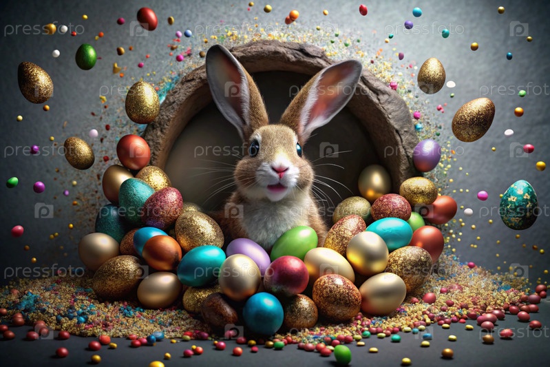 Известный праздник. милый пасхальный кролик заглядывает из ямы с красочными яйцами вокруг. концепция счастливой Пасхи