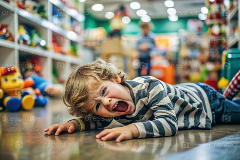 Маленький мальчик лежит на полу в магазине. Детская истерия. Ребенок кричит, плачет, становится капризным и истеричным. Недовольство