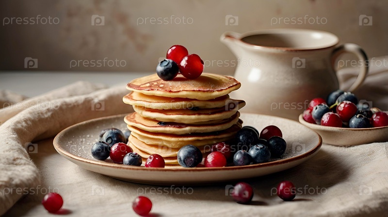 Русский праздник Масленицы. натюрморт с чашечкой чая, куча блинчиков с северными клюквами, кубики масла на столе