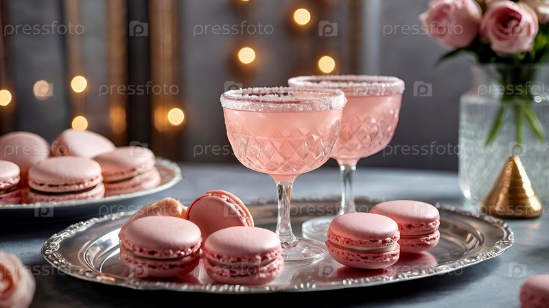 Элегантные мягкие розовые коктейли с льдом и морозом в винтажных бокалах на серебряном подносе с вишней и макаронами