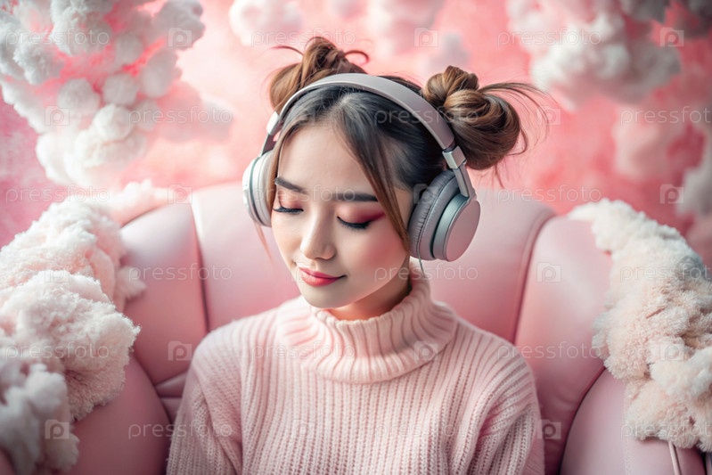 Молодая красивая японская девушка с розовыми волосами в аниме слушает музыку на беспроводных наушниках в розовых облаках