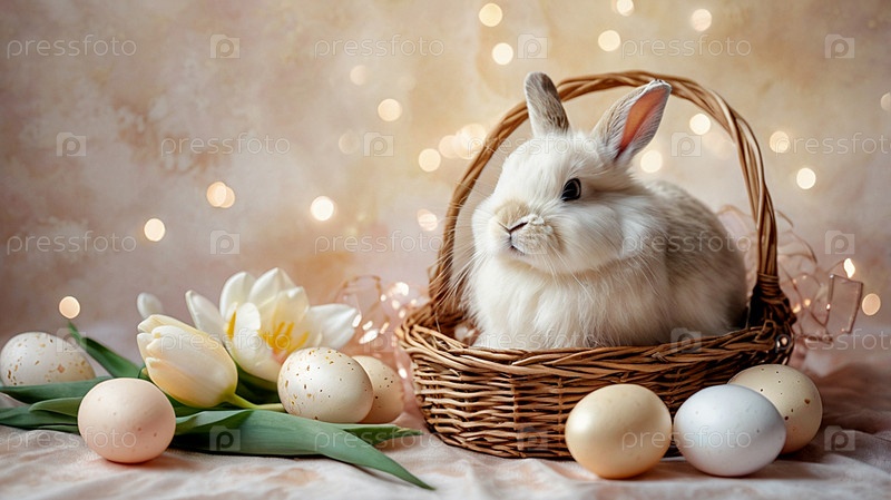 Нежные пасхальные жемчужинные яйца в корзине, кролик и нежные цветы на пастельном аквареле