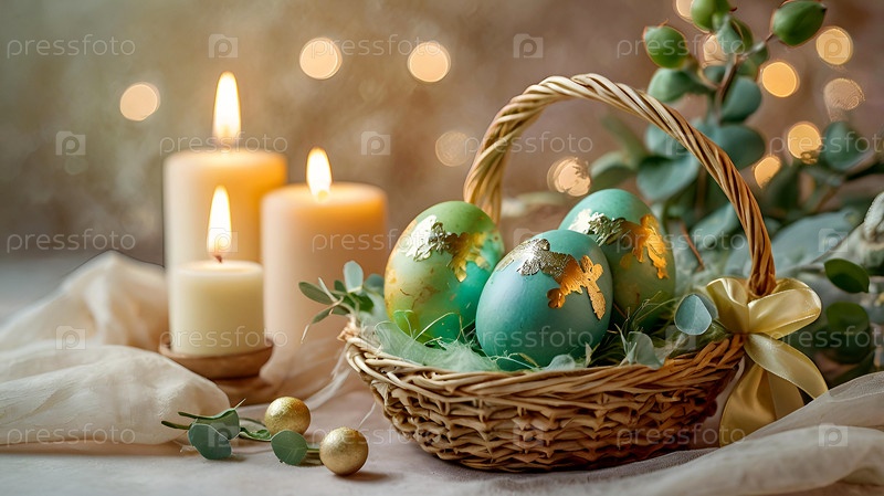 Нежные пасхальные яйца в корзине и зеленые ветви эвкалипта на пастельном аквареле с нежными венами