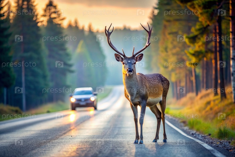 ДТП.Животное - это олень на дороге возле леса рано утром.Дорожные опасности, дикая природа и транспортное средство
