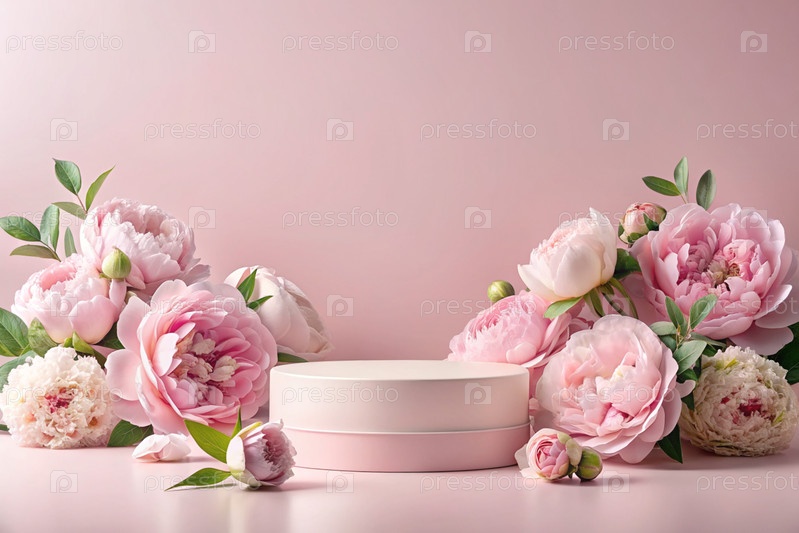 Минималистский розовый пастельный фон для демонстрации продукта.Современный подиум с розовой стеной и розовыми пионками вокруг.Креативный дизайн презентации продукции