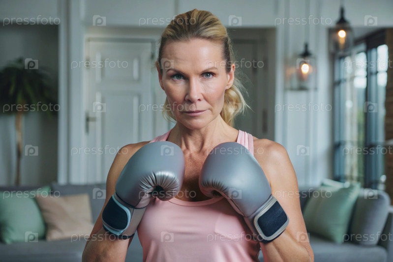 Портрет зрелой женщины: атлетичная, активная женщина средних лет в спортивной одежде и боксерских перчатках стоит на стенде и готовится к боксу дома