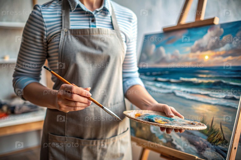 Близко. Понятие творческой деятельности. Художник в мастерской с маслом и кистью в руках. Искусство, креативность и отдых