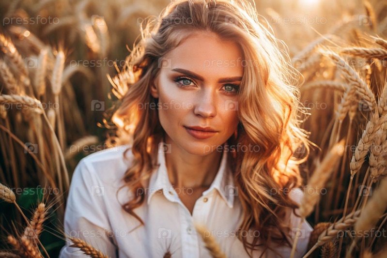 Молодая девушка в белой рубашке с золотыми волосами стоит на поле спелой золотистой пшеницы при закате солнца.Урожай, сельская природа и жизнь