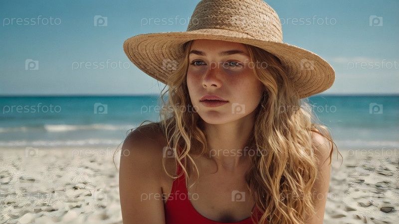 Женщина на отдыхе, сидящая в купальнике и соломенной шляпе с широкими краями на пляже в солнечный день и смотрящая на море