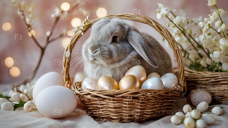 Нежные пасхальные жемчужинные яйца в корзине, кролик и нежные цветы на пастельном аквареле