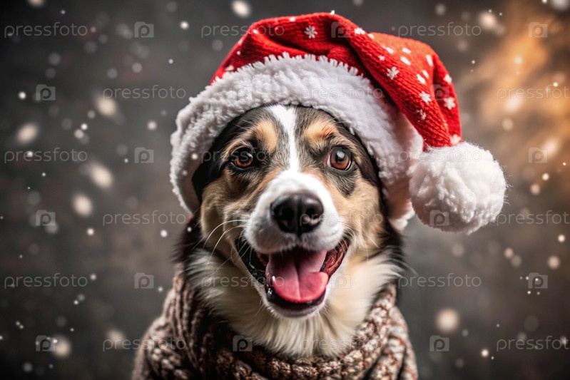 С Новым годом и счастливыми Рождествами! Падает снег. Веселая собака сидит в шляпе Санта-Клауса. Собака ждет праздника