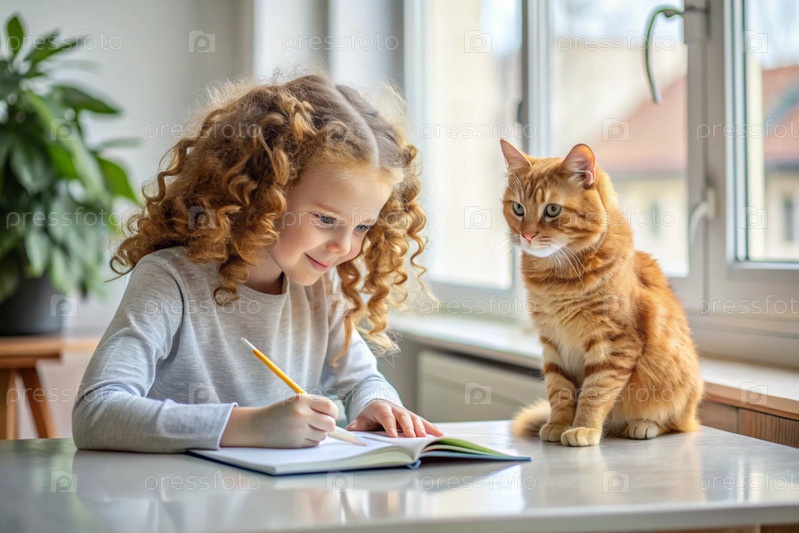 Образование и обучение. маленькая кудрявая девочка делает домашнее задание. ученик выполняет школьное дома. рядом со мной сидит рыжеволосая кошка