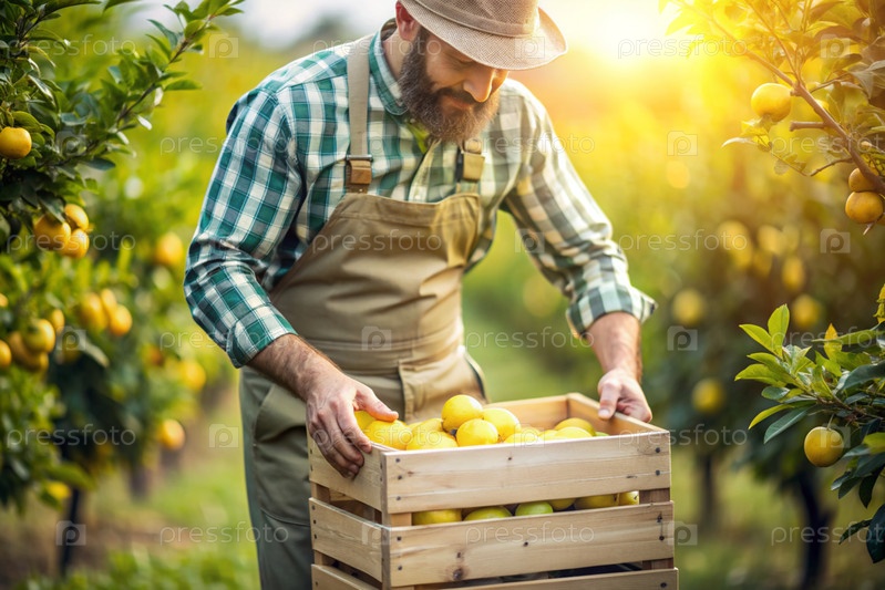 Сельскохозяйственная промышленность. Деревянный ящик с лимонами в руках фермера. Садовник собирает богатый урожай. Ближе, солнечный свет. Осенний плодовый сбор