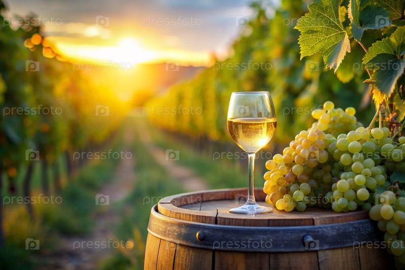 Стакан белого вина и куча спелых виноград на деревянной дубовой бочке на фоне виноградника