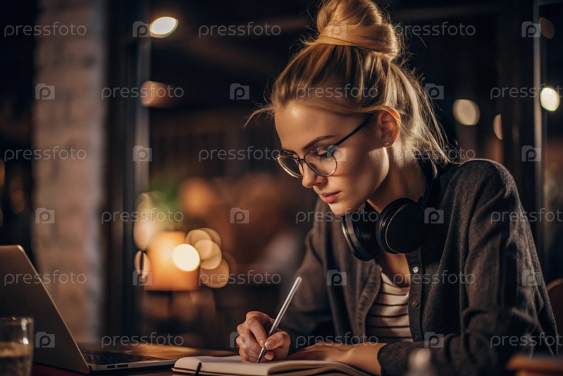 Молодая женщина фрилансер в очках и наушниках работает на ноутбуке или делает покупки в интернет-магазине
