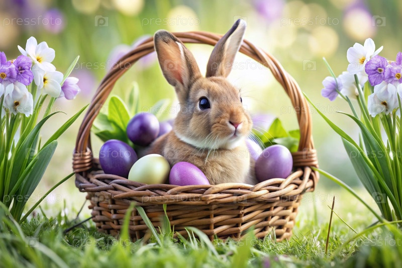 Баннер. пасхальный кролик в корзине из красочных пасхальных яиц вокруг весенних снегопадов и первичной розы. концепция праздника Пасхи