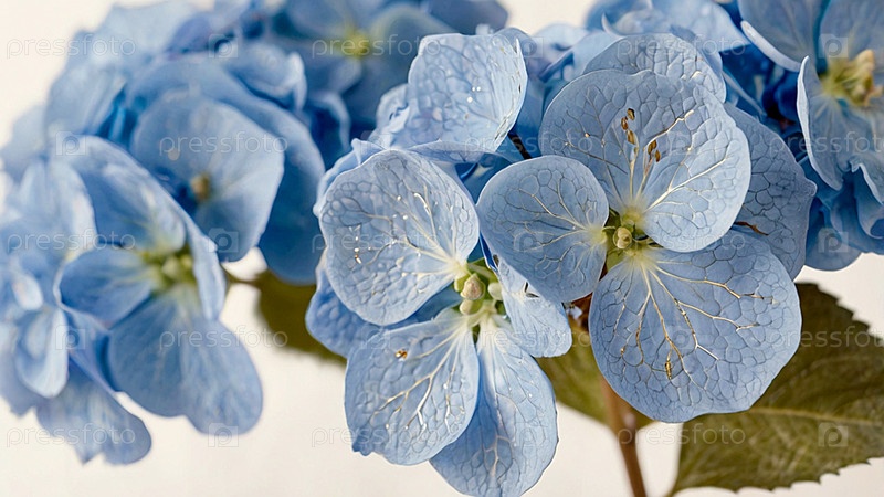 Голубые хортензии - это летние ароматные цветы. Красивый цветочный фон с красивым эффектом боке. Нежная голубая гортензия цветёт на белом акварельном фоне со золотыми венами
