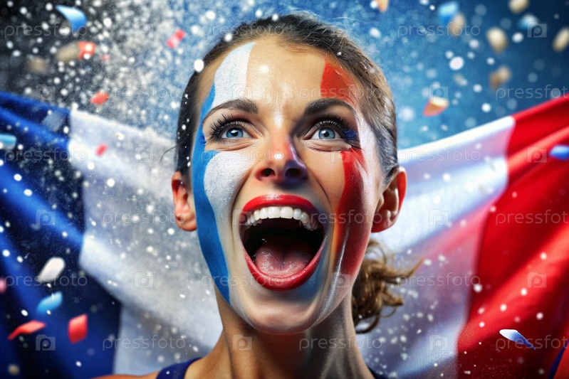 Красивая спортсменка или чирлидер из Франции с радостными криками после победы на Олимпийских играх на фоне французского флага