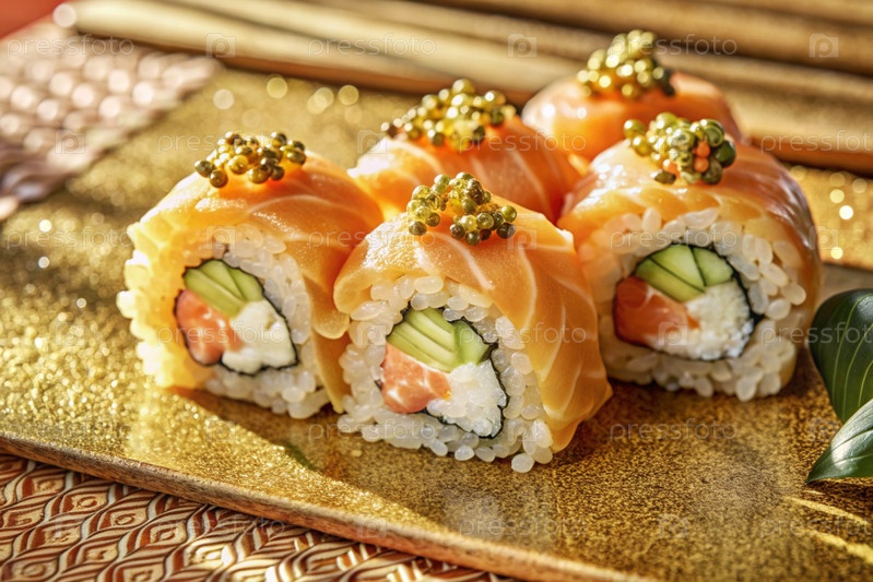 Японская еда. Суши-роллы Калифорния, Филадельфия с угорьем, красной икры и лососем. Концепция меню суши-бара