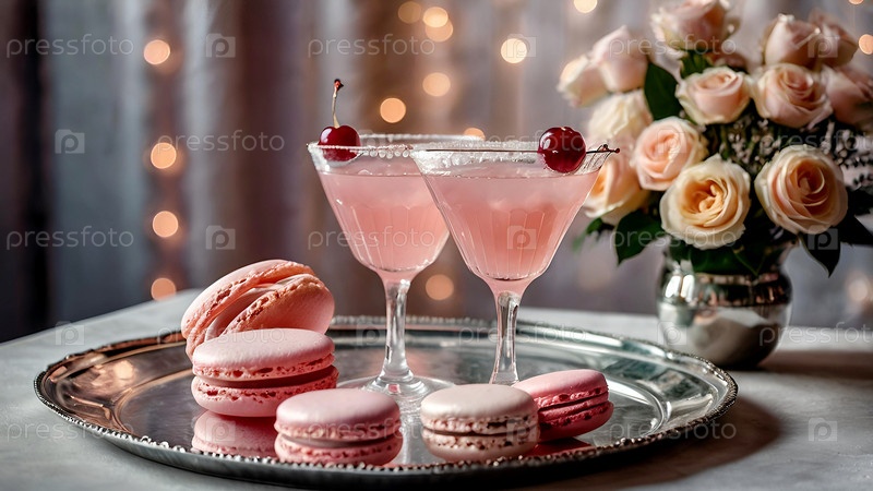 Элегантные мягкие розовые коктейли с льдом и морозом в винтажных бокалах на серебряном подносе с вишней и макаронами