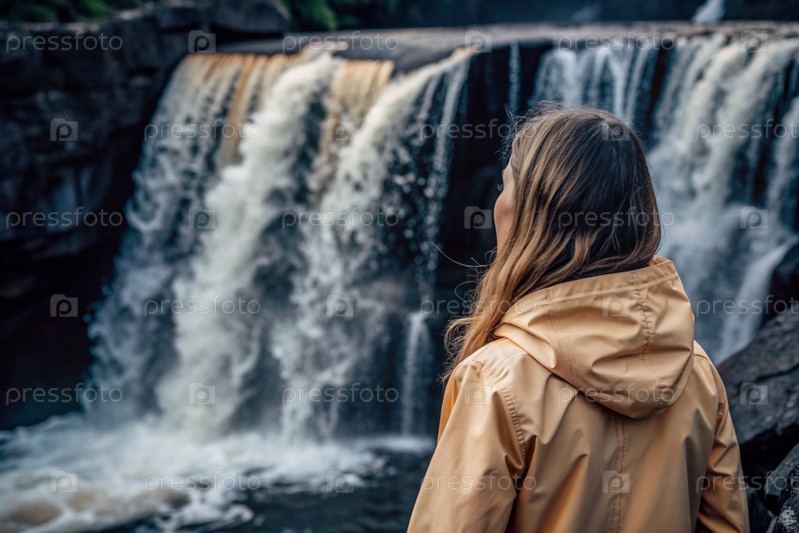 Женщина в резиновом плаще среди огромного голубого водопада. она путешествует и наслаждается жизнью и окружающей средой. туризм