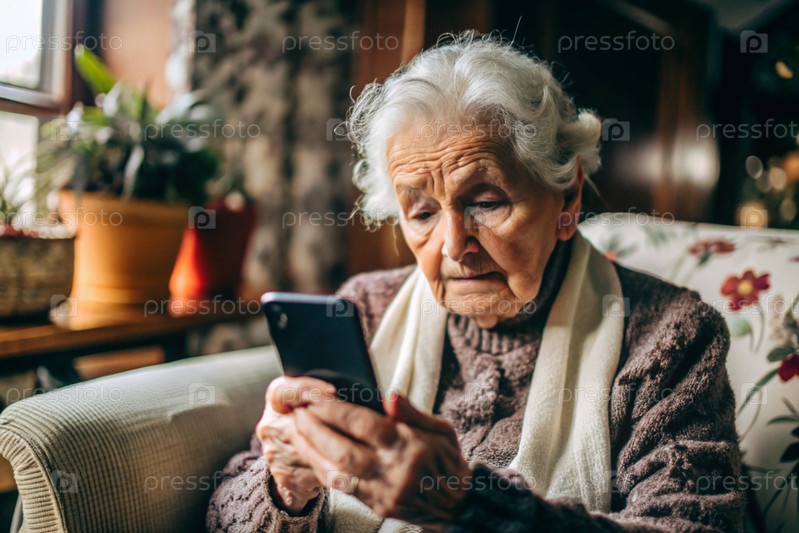 В шоке, обеспокоенная пожилая женщина смотрит на свой смартфон с неприятным удивлением, испытывая стресс, финансовые проблемы, кражу денег