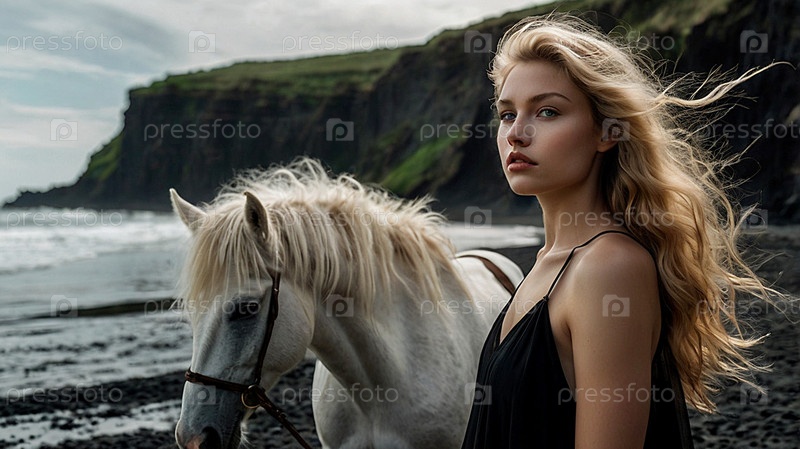 Портрет красивой женщины на пляже с черным песком против моря.Романтическая, спокойная и чувственная фотография девушки в нежном платье и лошади