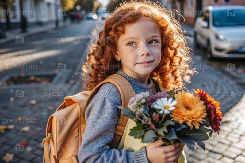 Красивая рыжеволосая девушка с очками и букетом осенних цветов впервые идет в школу. Ребенок со школьной сумкой, книгой и цветами. Малыш на городской улице