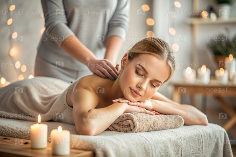 Баннер для профессиональных массажных салонов.Молодая, красивая блондинка наслаждается массажем в современном спа при свечах.Освобождение и гармония, уход за телом