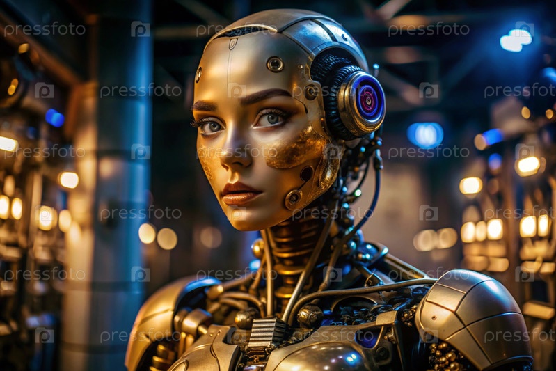Женский робот-киборг. Интеграция технологий и человеческого взаимодействия. Производство роботов. Искусственный интеллект, Интернет и цифровые технологии будущего