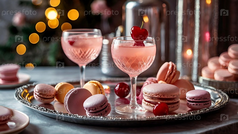 Элегантные мягкие розовые коктейли с льдом и морозом в винтажных бокалах на серебряном подносе с вишней и макаронами