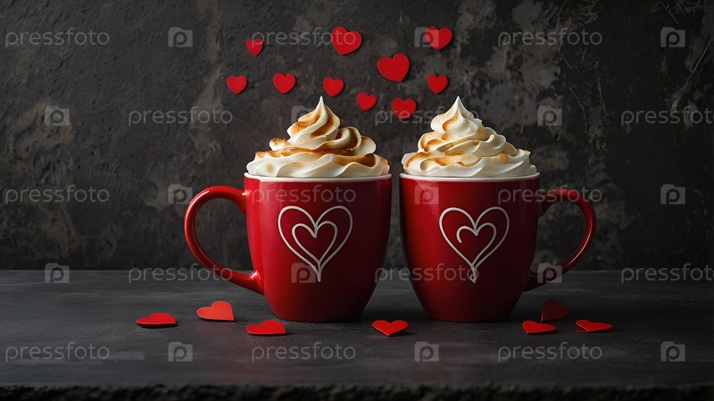Концепция Дня святого Валентина для кафе и ресторанов красные чашки кофе латте с сердцами вокруг горячие напитки для влюбленных