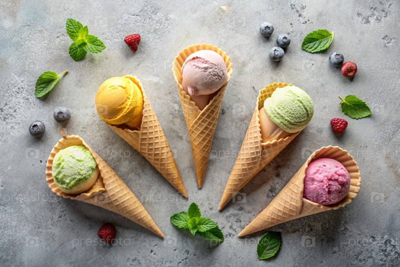 сладкий, холодный десерт. сливочное ванильное мороженое с различными вкусами в конусах пластинок. баннер, реклама. Всемирный день мороженого. сладкий десерт