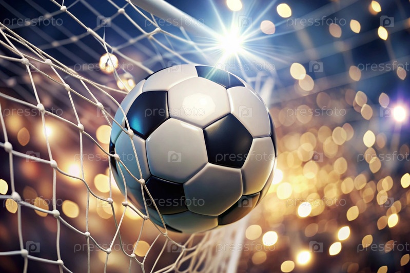 Футбольный мяч в ворота, среди сверкающих огней и размытого фона
