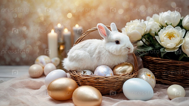 Нежные пасхальные жемчужинные яйца в корзине, кролик и нежные цветы на пастельном аквареле