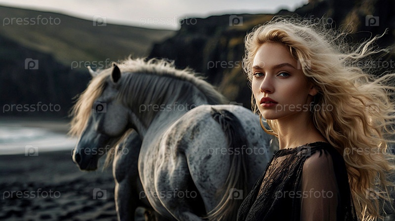 Портрет красивой женщины на пляже с черным песком против моря.Романтическая, спокойная и чувственная фотография девушки в нежном платье и лошади