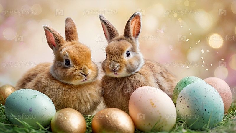 Концепция яркого пасхального праздника: нежные пасхальные яйца, кролики на пастельном фоне