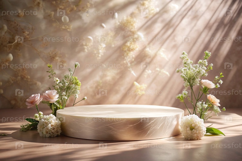 Минималистский розовый пастельный фон для демонстрации продукта.Современная подиум с розовой стеной и цветами вокруг.Креативный дизайн презентации продукции
