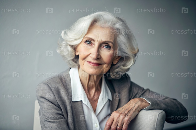 Минимализм.Студийный портрет стильной, элегантной пожилой женщины, 70-летнего пенсионера в интерьере и одежде спокойных тонов.Концепция пожилых людей