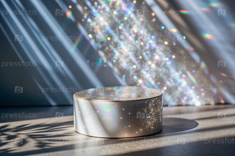 Пустой цилиндрический подиум со сверкающими кристаллами при преломлении света на минималистическом фоне, стенд для демонстрации моделей косметики и товаров