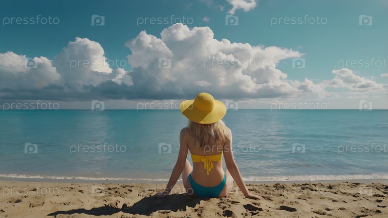 Женщина на отдыхе, сидящая в купальнике и соломенной шляпе с широкими краями на пляже в солнечный день и смотрящая на море
