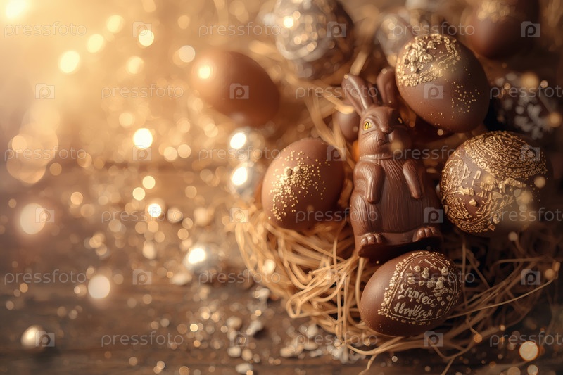 Концепция ярких пасхальных праздников в 2026 году. Красивая открытка. Баннер. Шоколадные пасхальные яйца и шоколадное зайцо на деревянном фоне. Пасхальные сладости и лакомства