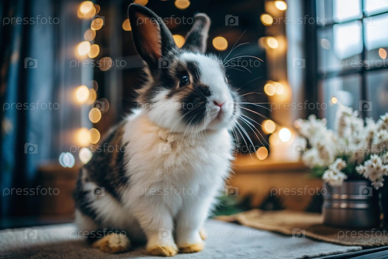 Маленький пушистый бело-черный кролик в качестве домашнего питомца во внутренней части квартиры