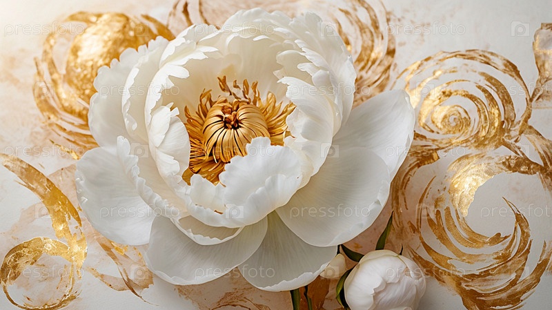 Пеони - это летние ароматные цветы. Красивый цветочный фон с красивым эффектом боке. Нежные белые бутончики пеони на фоне белого аквареля со золотыми венами