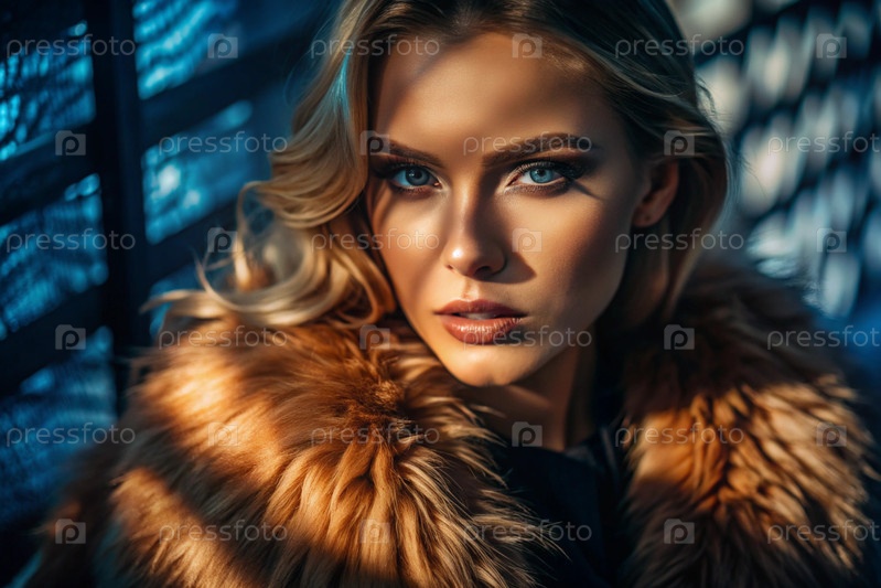 Красивый портрет российской модели в мехах на нейтральном синем фоне с контрастным освещением и тенями