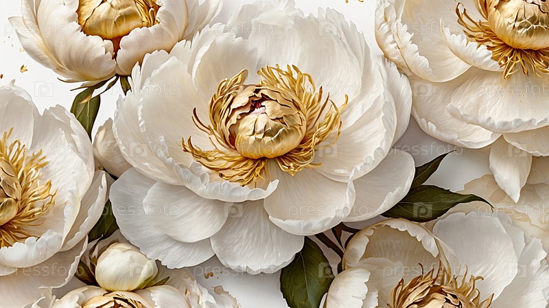 Пеони - это летние ароматные цветы. Красивый цветочный фон с красивым эффектом боке. Нежные белые бутончики пеони на фоне белого аквареля со золотыми венами
