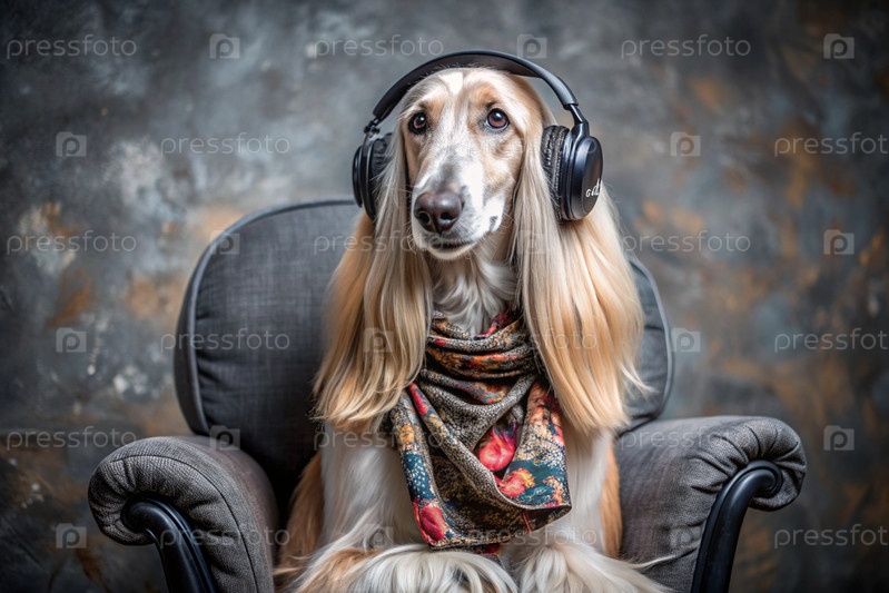 Музыкальный любитель.Афганская собака слушает музыку в больших беспроводных наушниках дома, на стуле в гостиной.Гармония, расслабление и омоложение