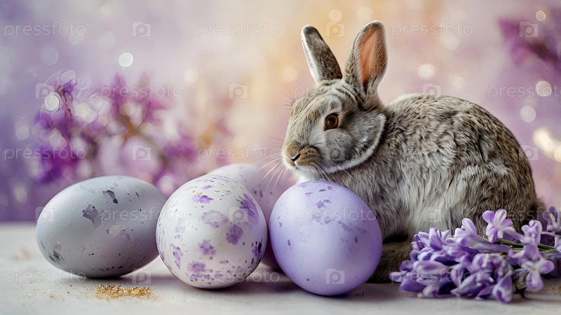 Нежные пасхальные яйца, серый кролик и фиолетовые цветы гиацинта на пастельном акварельном фоне с нежными венами