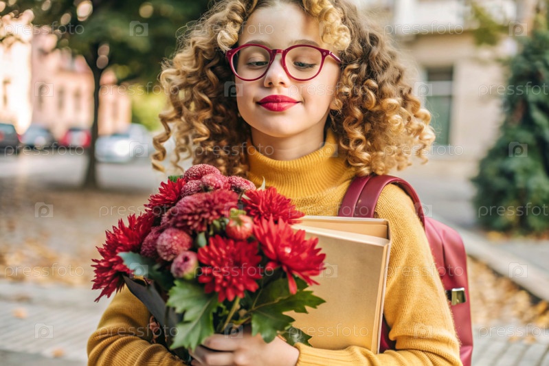 Красивая маленькая кудрявая девочка в очках и букете осенних цветов ходит в школу впервые. Ребенок со школьной сумкой, книгой и цветами. Малыш на городской улице. Возвращение к школе